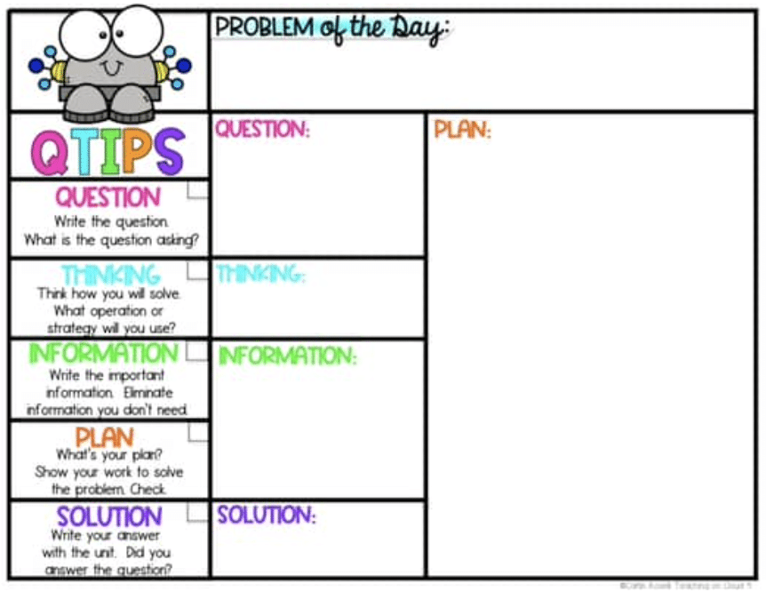 To help my students implement this strategy, I came up with a graphic organizer where they could follow the different steps of QTIPS to solve a word problem. This was very helpful to keep my students organized and on track. We started using this strategy for our problem of the day but it quickly carried over into my students’ daily work. I definitely saw a change in how they thought about and tackled word problems. They stopped just choosing any operation and put some thought behind their plan to solve. There are many skills that go into solving word problems but this strategy helped my students to take guessing out of the equation.